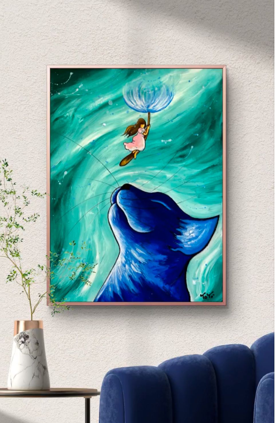 Ho rappresentato una fatina sopra un desiderio che gli sfiora il viso e lui l’ammira socchiudendo gli occhi, come solo loro sanno fare.