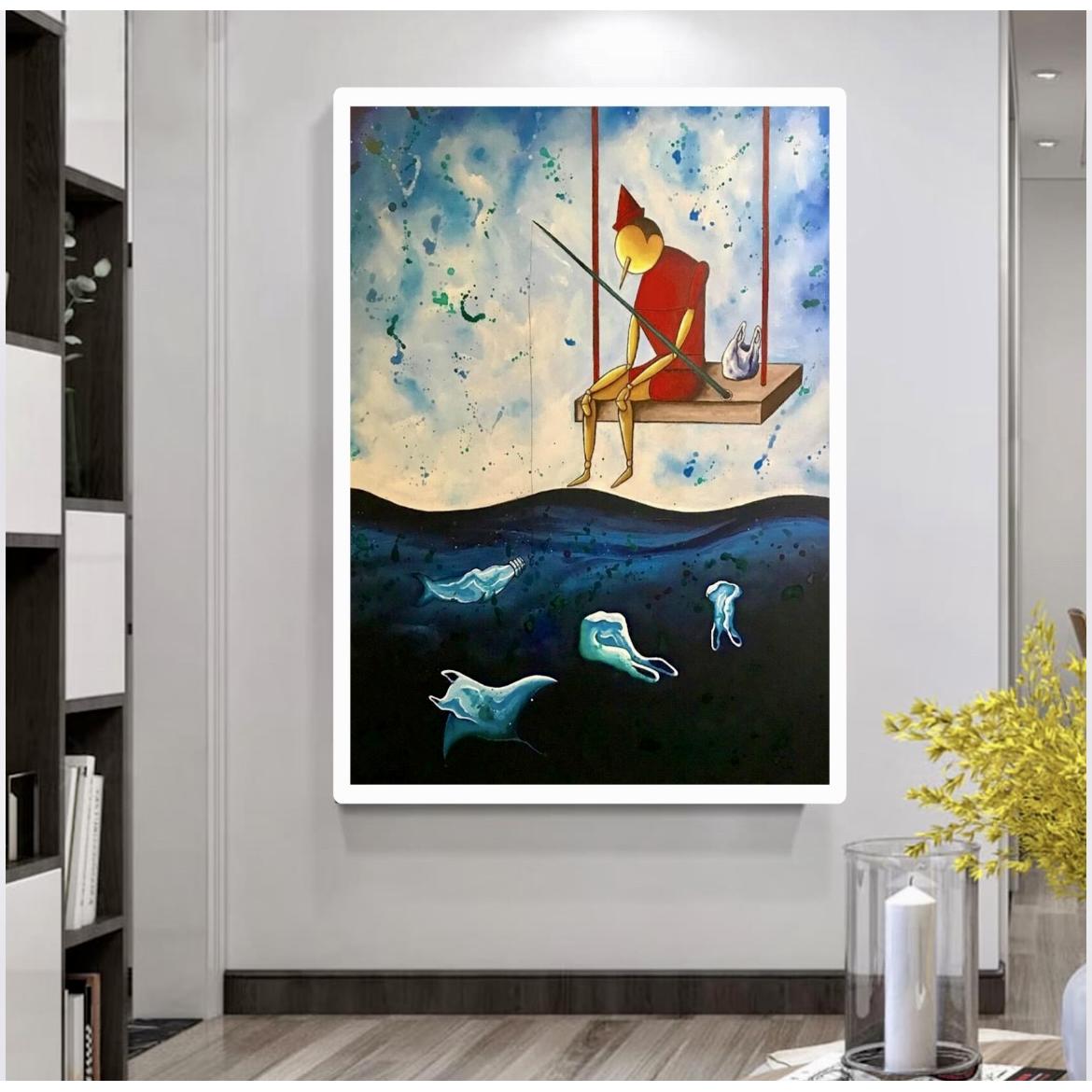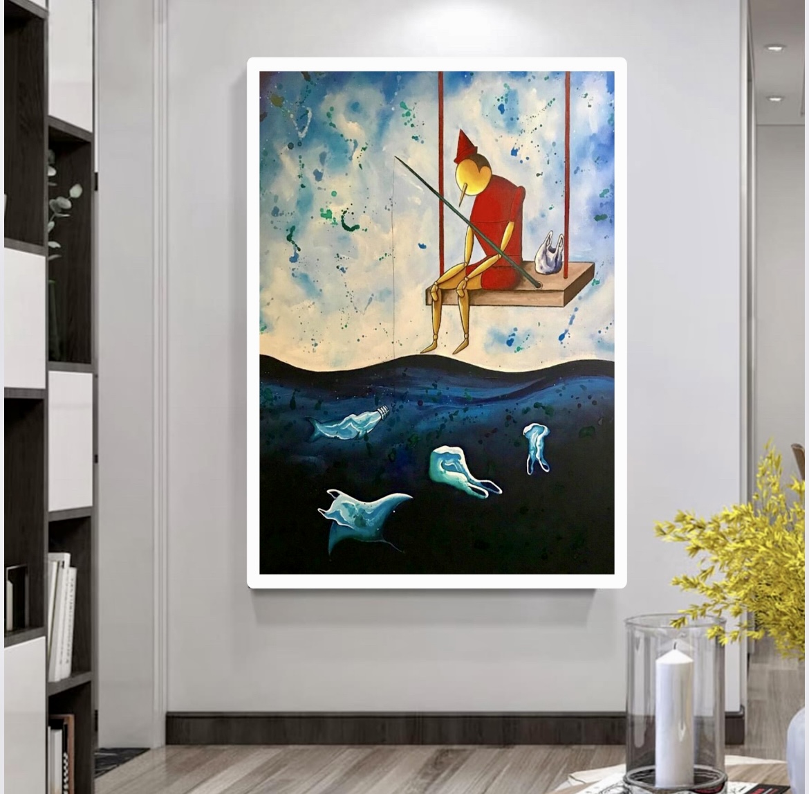 Un’opera che mira al cambiamento e raffigura un Pinocchio un po’ triste intendo a pescare in un mare in cui le creature che lo popolano si stanno pian piano tramutando in plastica! Un’opera che vuole essere uno spunto di riflessione con lo scopo di incoraggiare all’azione, per cercare di migliorare il mondo di cui siamo ospiti!