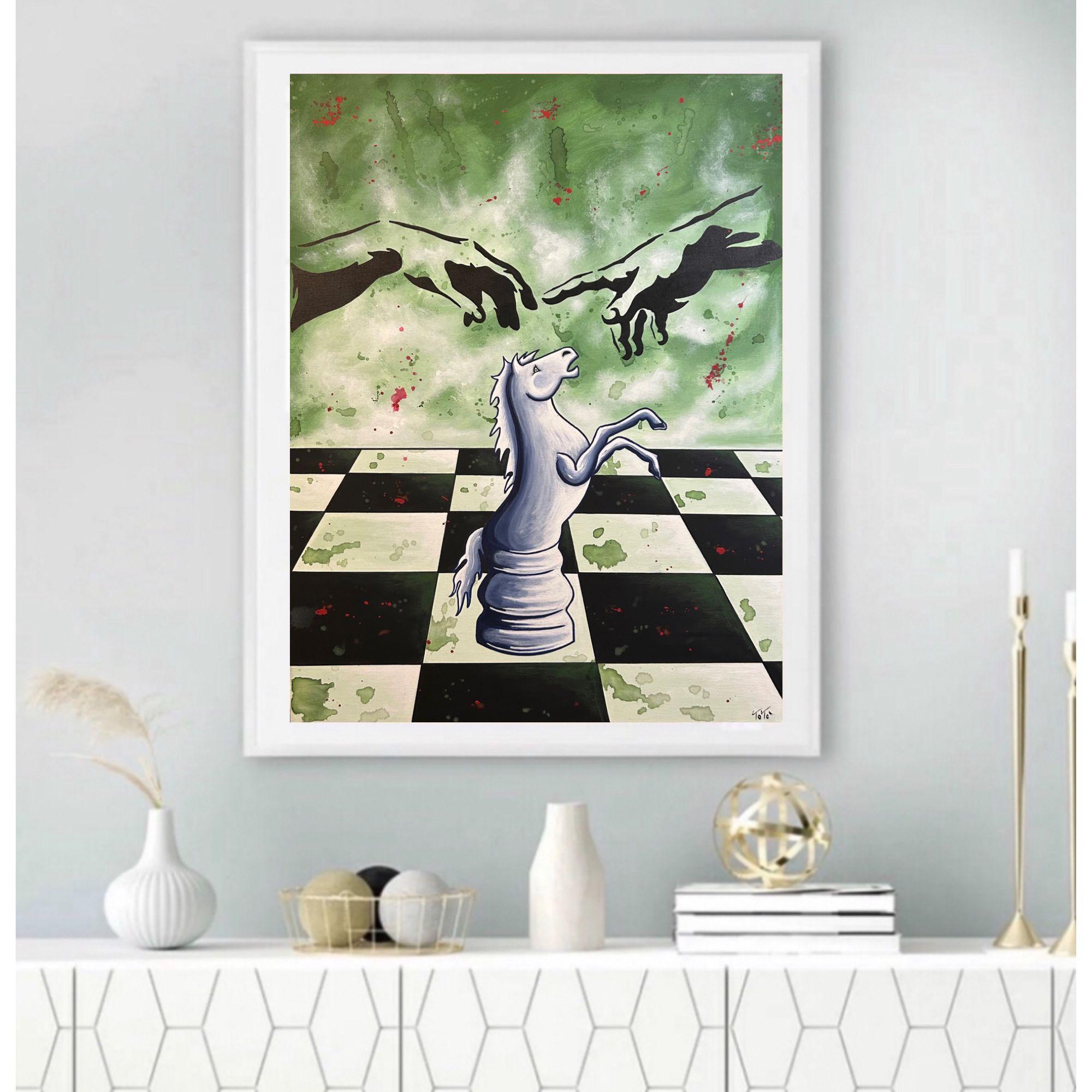 Realizzando quest’pera, ho immaginato la creazione di uno dei giochi di strategia più antichi, magici e misteriosi della storia, gli scacchi. L’ho raffigurato partendo dalla nascita del primo pezzo, il cavallo. Ho voluto catturare l'essenza del gioco e della creazione, fondendo il metafisico con il surrealismo. Le mani che emergono dal nulla rappresentano un potere invisibile che guida la vita e la strategia, mentre il cavallo, simbolo di movimento e cambiamento, si anima sull'eterna scacchiera della realtà.